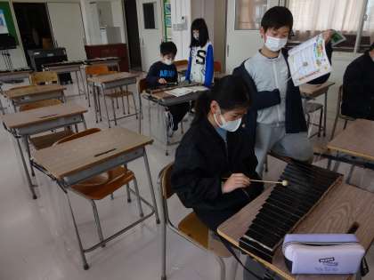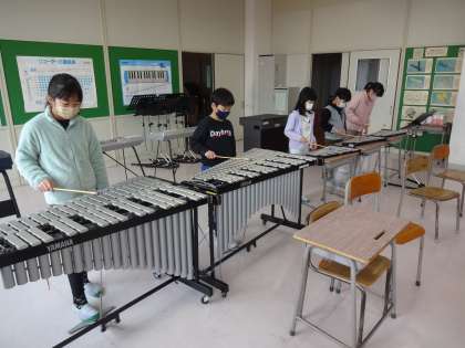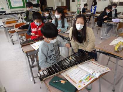 音楽専科の先生の伴奏に合わせて、拍に乗って演奏することができました。