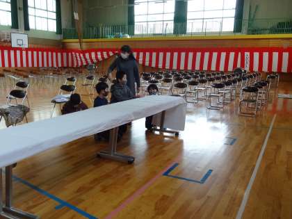 5年生の子供たちは、学校に残って、卒業式の準備をしました。校内の清掃を念入りに行い、式場や卒業生の教室等の環境整備もしっかりとやり遂げました。