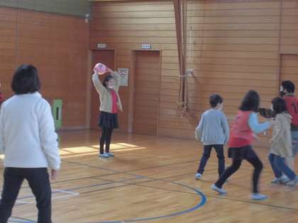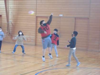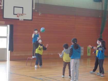 ポートボールの試合をしました。ドリブル、パス、シュートの技能が向上しています。相手のシュートやパスをカットしようと必死に頑張りました。