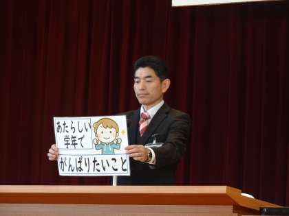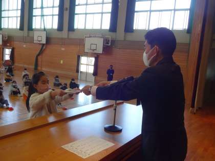 修了証授与の後、校長先生は、「新しい学年になったら、頑張りたいことを決めておく」という春休みの宿題を出されました。パラリンピックで金メダルを獲得した川除選手は、4年後に向けて頑張ることを決めている話もされました。