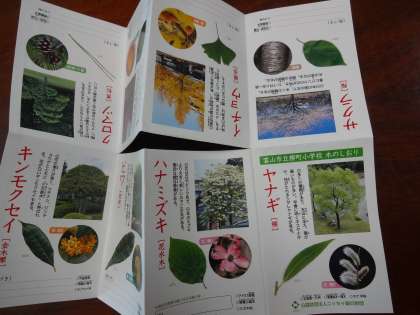 本校にある樹木の中から8種類選んで、しおりになっています。切れ目を切れて、折り曲げて、本のようにしました。子供たちは、いくつ知っているかな。
