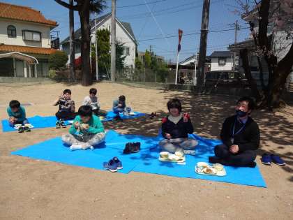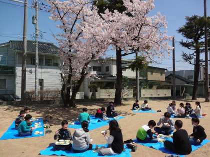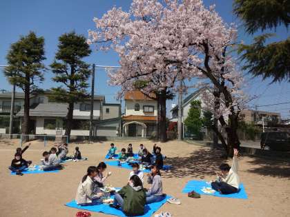 桜が満開と咲く下で、6年生になってから初めての給食を頂きました。暖かい陽気で、より給食がおいしく感じられました。