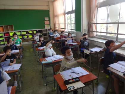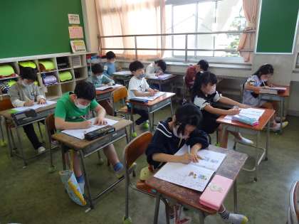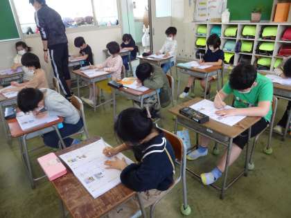 モニターに映し出された筆順アニメーションに合わせて、空書きしてから、ワークに丁寧に書きました。