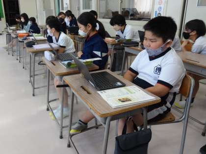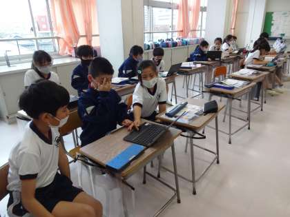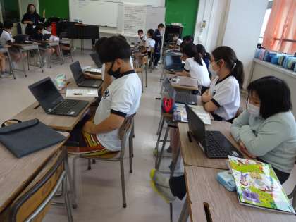 子供たちは、クロームブックで、フィギュアスケートの浅田真央選手の動画を視聴しています。