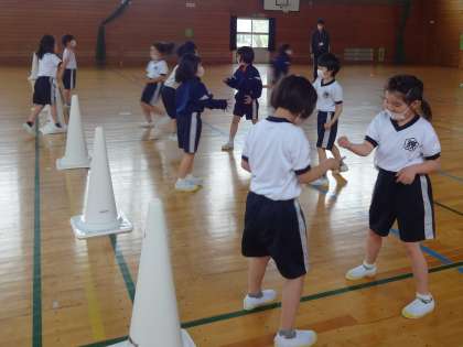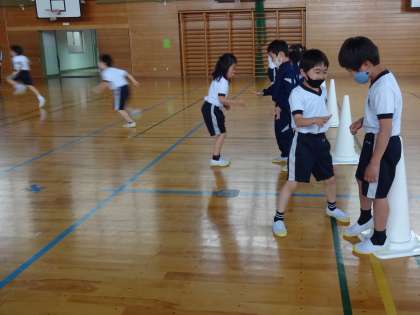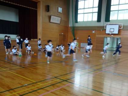 折り返しリレーで競走をしていますが、いつもとルールは違います。折り返し地点に「じゃんけんマン」がいて、じゃんけんに勝つと戻ることができるのです。運も味方につけないといけませんね。
