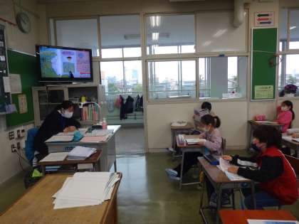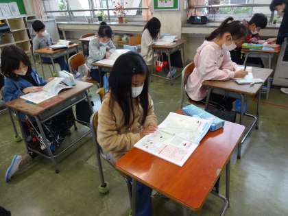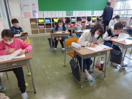 資料集の富山市中心部の地図を見て、柳町小学校はどこにあるのか見付けました。先生のヒントや手がかりによって、無事に見付けることができました。