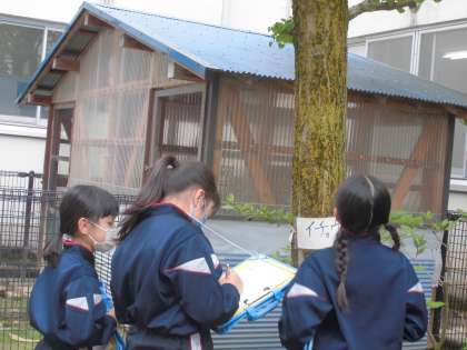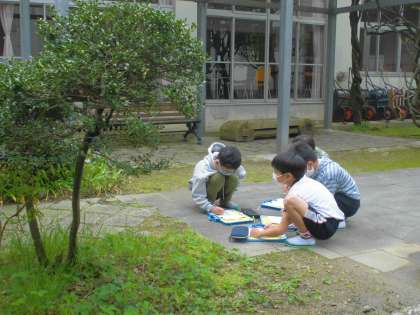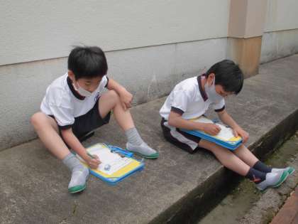 中庭で、一年間観察を続ける植物を一人一人が決めて、スケッチしました。自分が選んだ植物が、どう変化していくか楽しみですね。