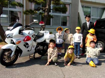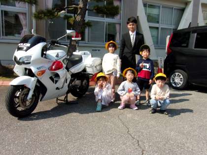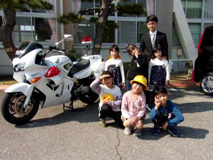 交通安全教室が終わると、富山中央警察署係長さんが、乗ってこられた白バイと一緒に、写真を撮ってもよいと言われました。