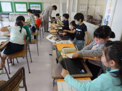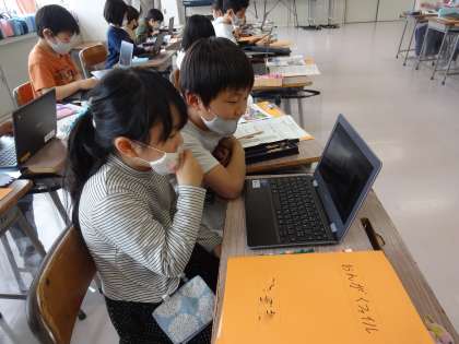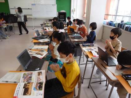 クロームブックで動画を視聴し、いろいろな国の踊りの音楽を楽しんでいます。
