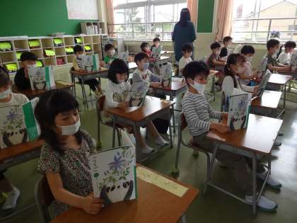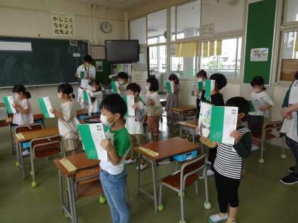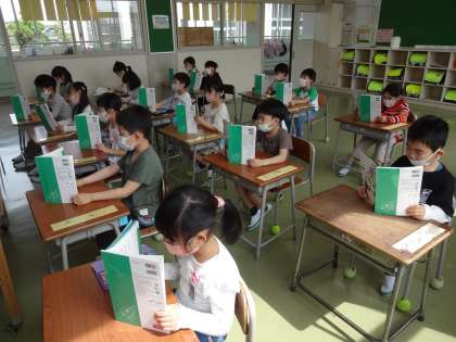 教科書を手に持って、音読学習です。座ったり立ったりしながら、明るい声で元気よく発声しました。