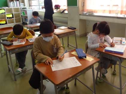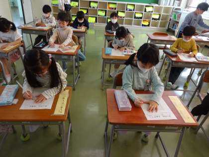 先日、学校探検をした子供たちは、発見カードに探検したことを記録しています。