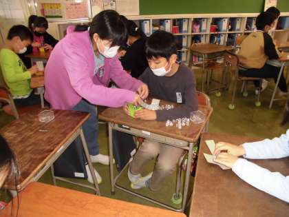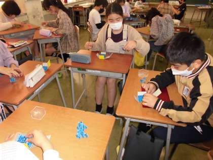 前回、体積の公式を学習した子供たち。今日は、もう一度その公式の意味を確かめるため、1㎤の立法体を、直方体や立方体の型の中に積み重ねていきました。時間のかかる作業でしたが、公式の意味をよく理解することができました。