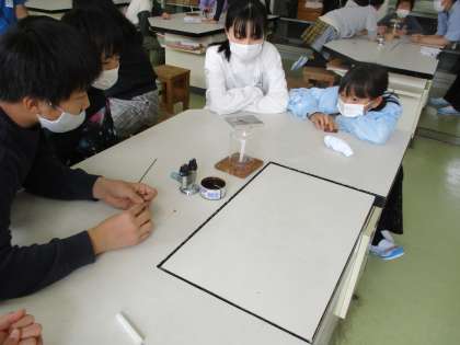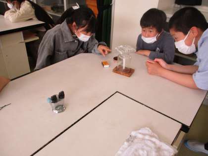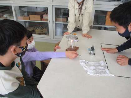 さまざな条件でろうそくの燃え方を観察しました。ろうそくが燃え続けるには、新しい空気を送り込む必要があることが分かりました。