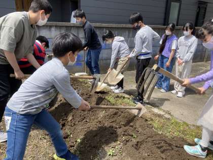 じゃがいもとほうせんかの種を植えました。種芋を初めて見る子供が多く、普段食べているじゃがいもと比較して形の違いや感触が違うことに子供たちは驚いていました。