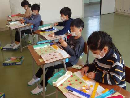 ブロックを使って数えたり、絵を線で結んだりしながら答えを見付けました。