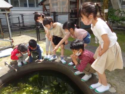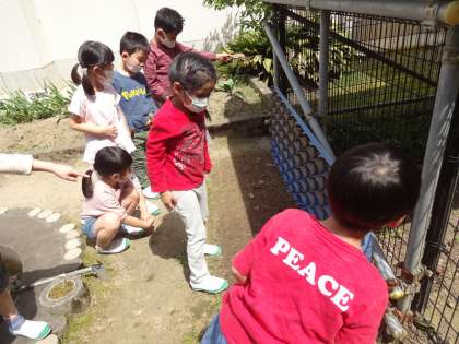 「カエルだ。」「そっとしておかないと、かわいそうだよ。」