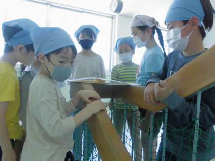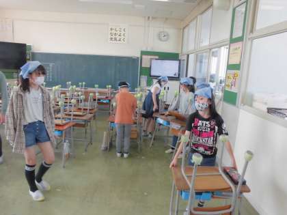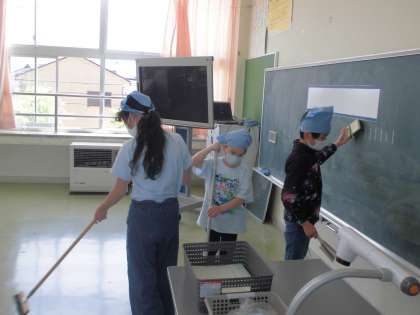 今日からなかよし清掃が始まりました。高学年の児童がリーダーとなって、下学年の児童に場所や仕事分担、清掃方法をやさしく教えていました。