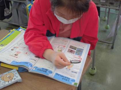 生き物を観察するために、虫眼鏡の使い方を学びました。ノートにまとめた後に、教科書の端にある小さなアリの写真を観察しました。