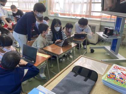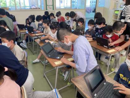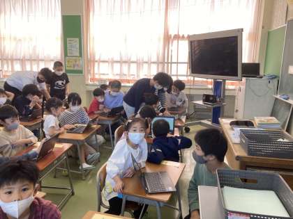 1年生は、入学してから初めてクロームブックを使います。そこで、6年生がログインの方法や正しい使い方を教えてあげました。1年生との仲がさらに深まりました。