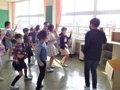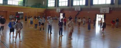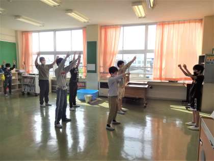 上学年は、これまでも体操をしてきているので、しっかりと運動できました。コロナウイルス感染症対策で、活動場所を分散して行っています。