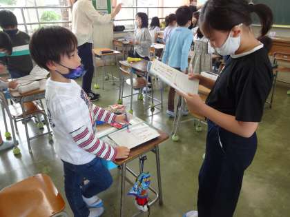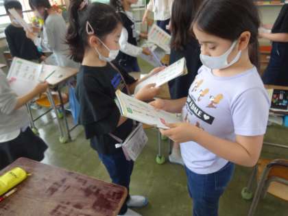 次に、ペアを見付けて、じゃんけんし、英会話を楽しみました。そして、尋ねた人の名前をワークブックに記入しました。