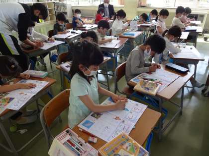 手本をよく見て、書き始めの位置から書き終わりの位置まで、気を付けて書いています。