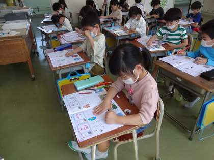 「か」「さ」「つ」「る」など、平仮名の練習に取り組んでいます。