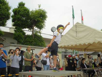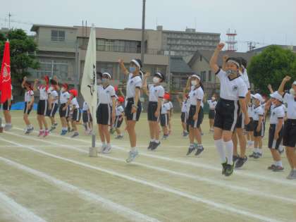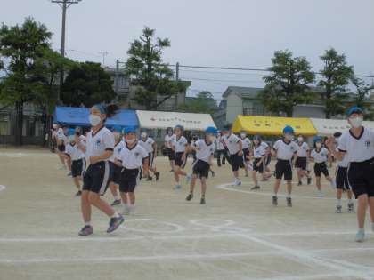 運動委員長の指揮で全校児童が、準備運動としてきときと夢体操をしました。朝の時間に練習してきたので、上手にできました。