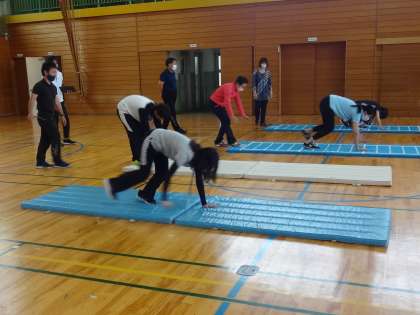 新体力テストの正しい測定方法と記録を伸ばすための指導法、マット遊び・マット運動の技能を向上させるための指導法について研修を深めました。
