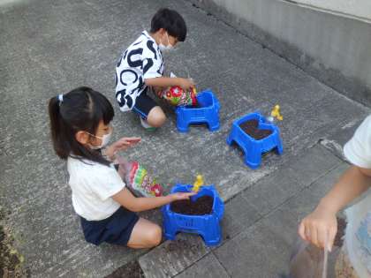 土はどのくらい入れたらよいかを考えたり、種をどの向きで土に入れたらよいかを話し合ったりしながら、種まきのやり方を学びました。