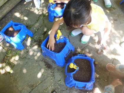 まき終わるやいなや、水をかけてあげようと蛇口へ向かって行く子供たちでした。