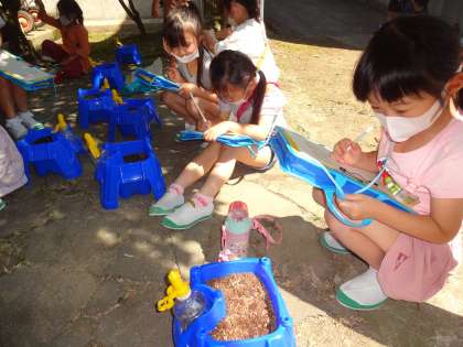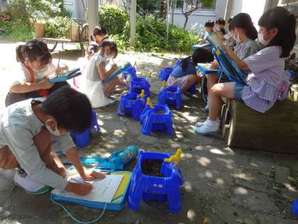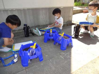 昨日、アサガオの種を植えました。今日は、種を植えた鉢を見ながら、観察カードに記録しました。