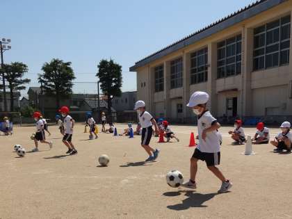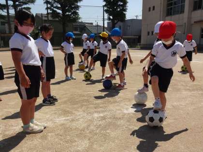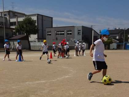 次に、色団ごとに分かれて、ボール蹴りリレーをしました。