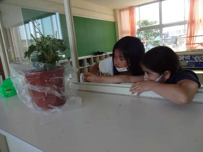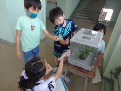「ホウセンカの芽」「アゲハの幼虫」「アゲハのさなぎ」「モンシロチョウの幼虫」「モンシロチョウのさなぎ」の中から、観察するものを選びました。