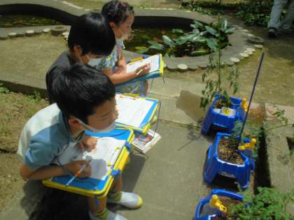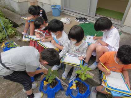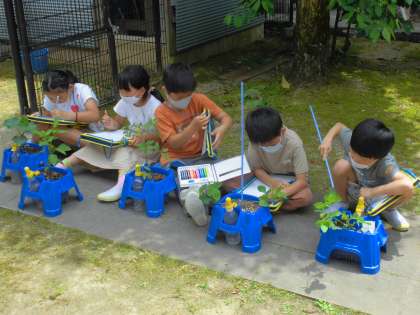 ミニトマトが倒れかけているお友達に、「ひもで茎と棒を結べばいいよ」とアドバイスする姿も見られました。収穫できる日が待ち遠しいです。