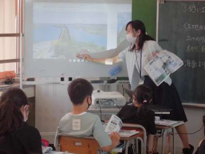 写真を見ながら、千本松原が水害を防ぐ役割があることなど、気付いたことを発表して、昔から苦しんでいた水害に対する工夫について学びました。