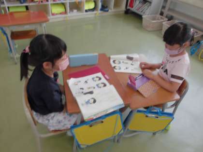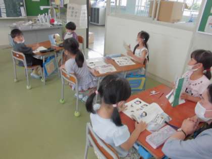絵を見て、その人の気持ちと、そういう気持ちになった訳を考えました。その後、「私は○○です。どうしてかというと、△△だからです。」という形にまとめて、自分の考えをペアで発表しました。