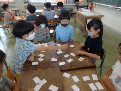 各グループに分かれて、漢字の神経衰弱ゲームです。うまくペアのかるたを見付けられると大喜びしました。