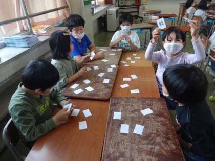同じ部分をもつ漢字を見付け、正しく読めるようになるために、先生特製の漢字かるたをしました。