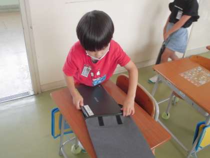 クロームブックのカメラの使い方を学びました。その後、新品のクロームブックケースに入れて中庭に移動し、実際に撮影しました。あっという間に使い方を習得した1年生でした。