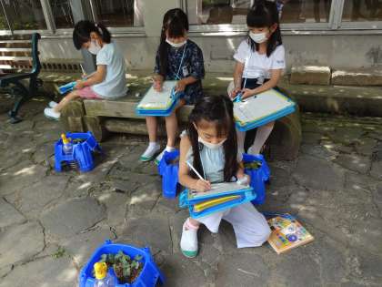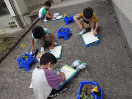 たくさんのアサガオの芽が、顔を出しました。その様子を観察カードに描きました。