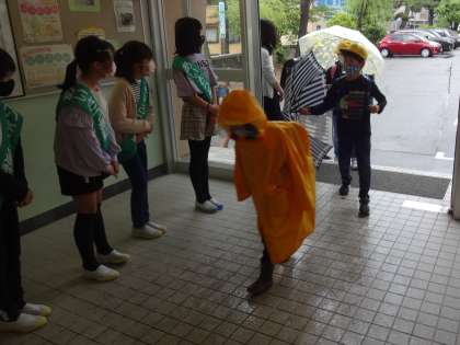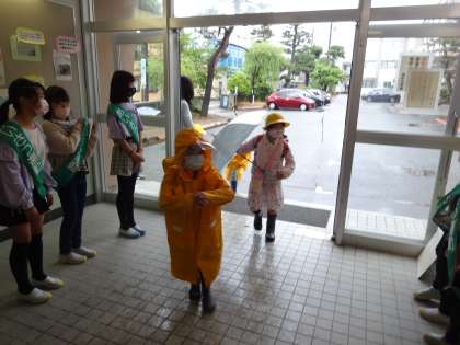 あいさつ運動に参加する登校班は、日替わりです。初日は、稲荷町一丁目の子供たちが参加しました。