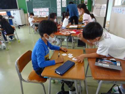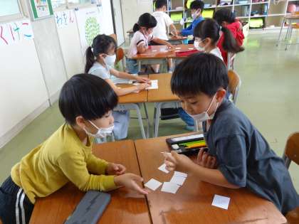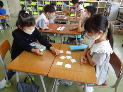 カードゲームをしながら、ペアの友達と10になる数字の組み合わせを確認しました。