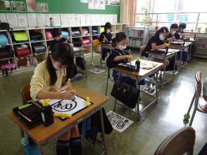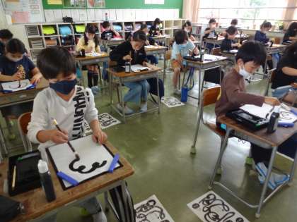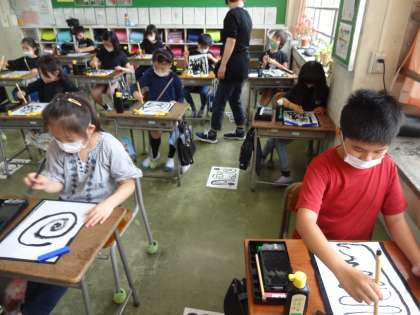 今日は、筆の軸を立てながら正しい姿勢で書くことや、ぼく液をたっぷり付けて続けて筆を運ぶことを学びました。