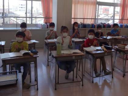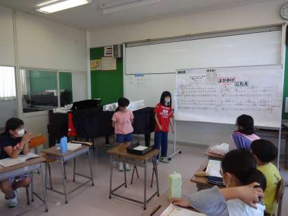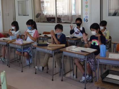 友達と気持ち・リズムを合わせて手を打つ技能を高めつつ、隣の友達の音を聴く耳、クラス全体の音を聴く耳も育んでいます。