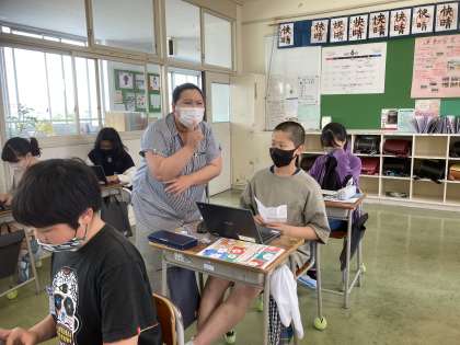来週の外国語科の時間、ALTの先生に旅先案内をします。有名な食べ物や建物などスライドを使って紹介します。今日は、ALTの先生に、英語の発音の仕方やスライドの表し方などのアドバイスをいただきました。
