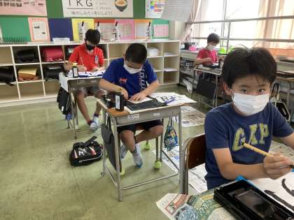 今日は、「湖」の清書です。「さんずい」「古」「月」の組み立てに注意して書きました。