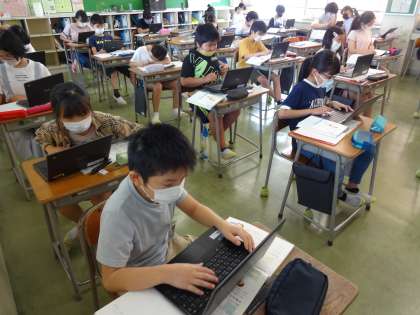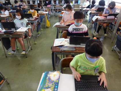 子供たちは、気付いたことや驚いたこと等の材料を集め、そのときの様子や感じたことを単文で表しました。また、季語には、どのようなものがあるのかクロームブックを活用して調べました。