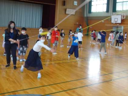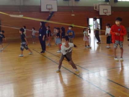 低学年は、体育館でフォームをよくする練習をしました。