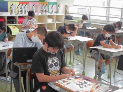 防火ポスターを製作しています。どのようにしたら防火に対する意識が高まるか、火災の怖さが伝わるかなどを意識して取り組んでいます。どのような作品ができるのか、完成が楽しみです。